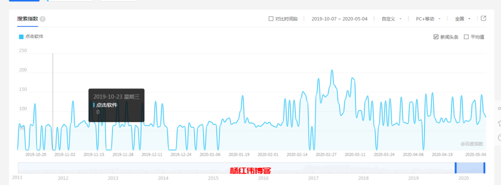 我们再来看下网上搜索点击软件的指数吧,我们通过百度指数可以发现点击软件的百度指数基本上维持在100-200之间,可以说明现在这方面需求已经明显减少了,但是还是有一定的需求,不论他是想自己用还是想搞破坏,都说明有用户需要它。