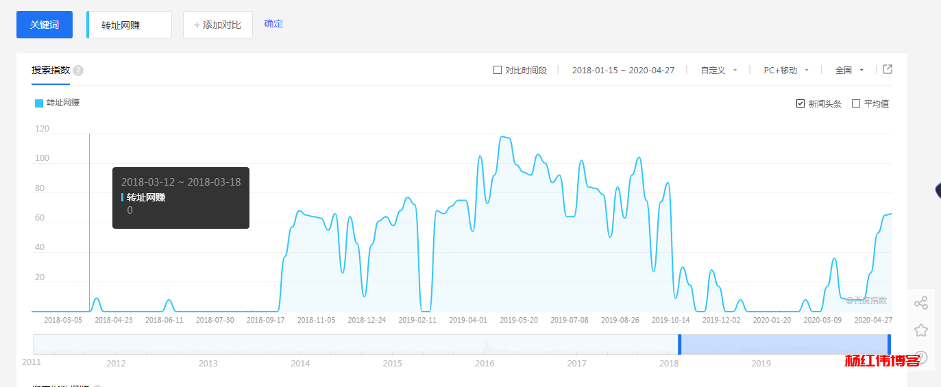 前面我写过一篇文章也是关于转址赚钱的,《转址赚钱怎么玩?转址赚钱技巧分析与总结》。今天杨红伟博客要和大家来聊聊转址赚钱,想说说移动互联网时代转址网赚是否值得继续去做。既然我们要做转址网赚,那么我们先来看看这个词的搜索指数吧!