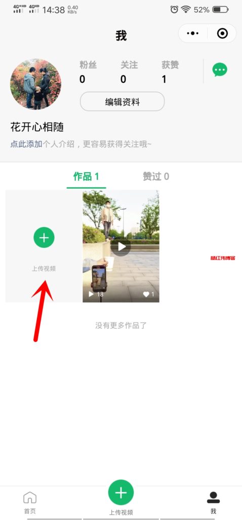 这个就是我们进入看一看+小程序的我的页面,在这里就可以上传视频了。最主要是这里上传的视频会有着更多的推荐流量。
